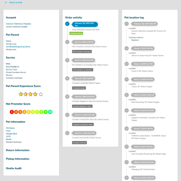 Once aftercare services are completed, Angelpaw Network gathers satisfaction scores via Pet Parent Experience Score (PPES) and Net Promoter Score (NPS) for each order. Vet groups have full visibility and understanding of their pet parent's satisfaction with their aftercare provider.
